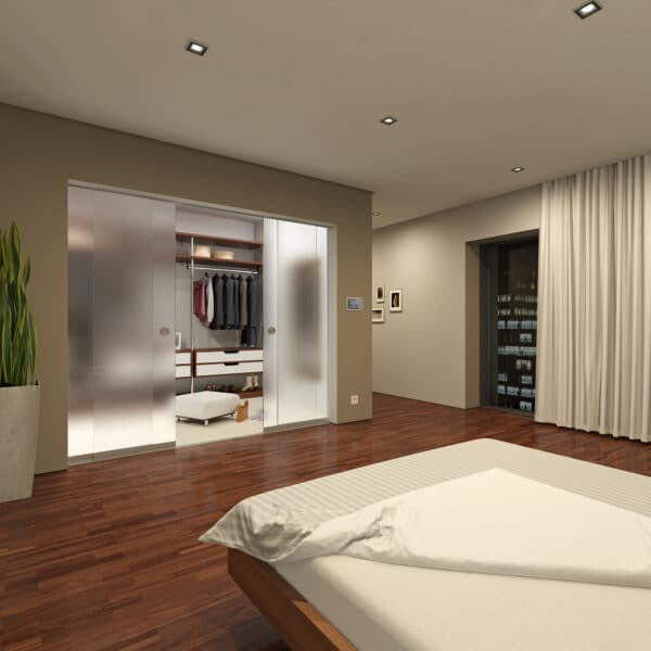 This innovative top-running, frameless slide and turn door provides a stylish, minimalist appearance when closed.